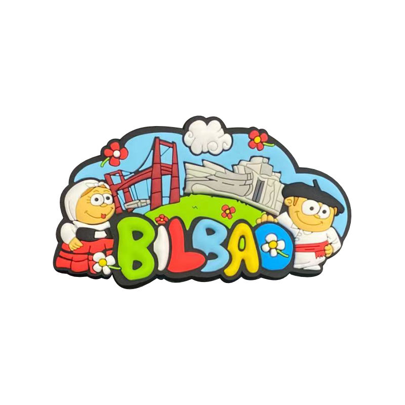 Palabra Bilbao con 2 bilbainitos, el puente Bizkaia y el Guggen de fondo.